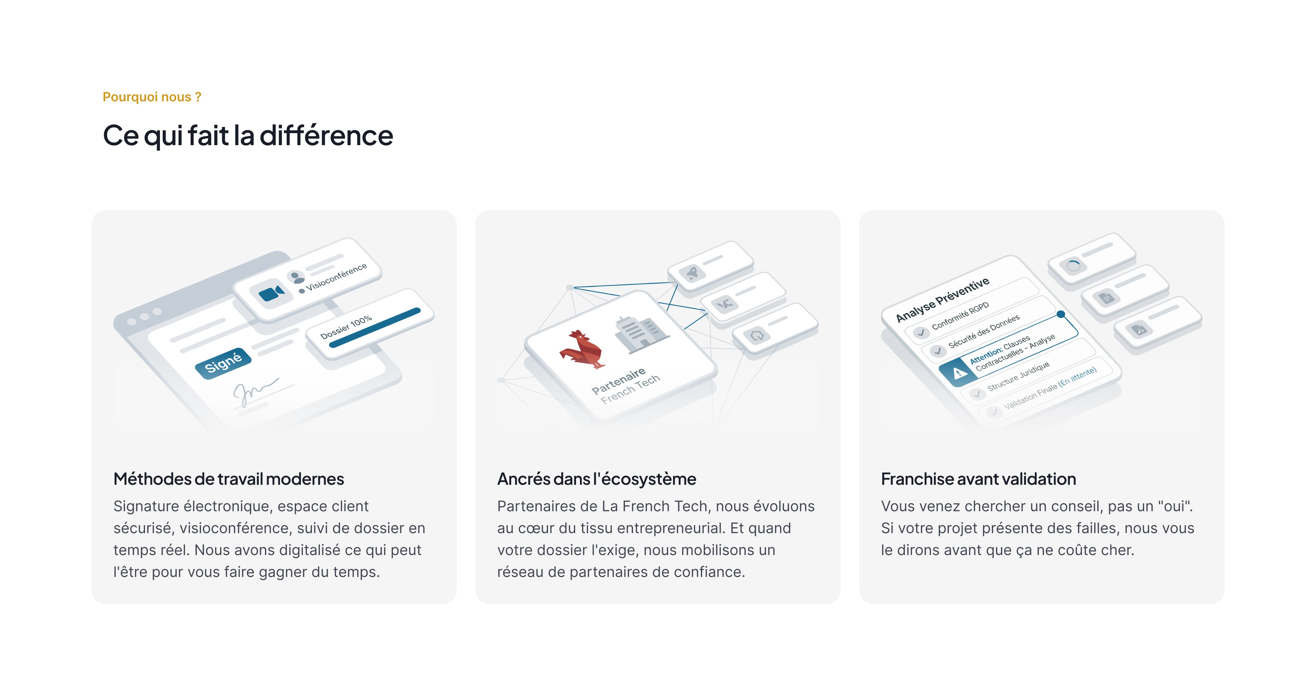 Cette section y répond sans qu'il ait à les formuler. Méthodes modernes : oui, on signe en ligne, on échange en visio. Ancrage écosystème : oui, on est partenaires French Tech, on a un réseau à activer si besoin. Franchise : oui, on vous dira si c'est bancal.