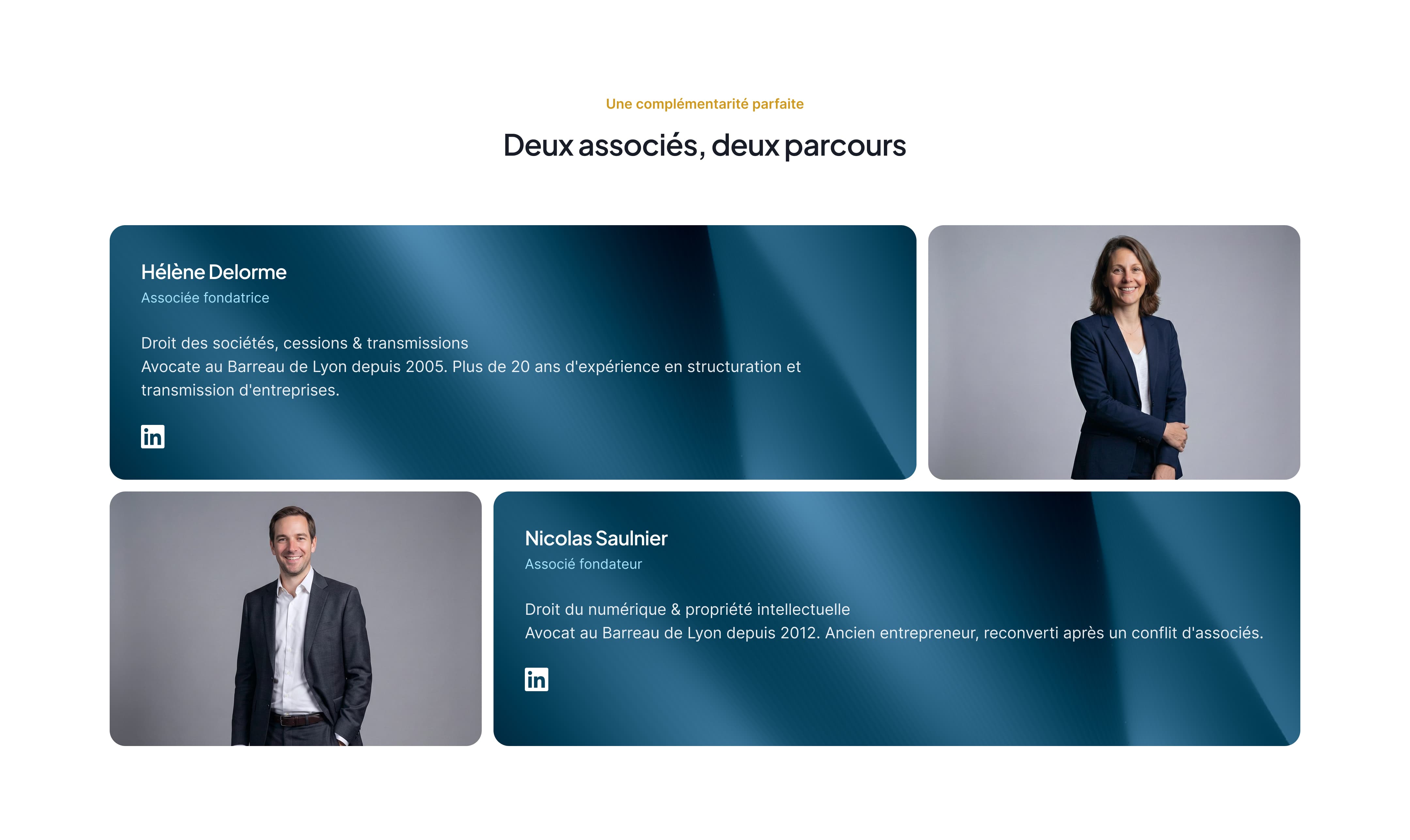 Ici, Hélène et Nicolas apparaissent sur la page d'accueil. Le visiteur ne se demande plus "Est-ce que ce cabinet est compétent ?". Il se demande "Est-ce que je me vois travailler avec ces deux personnes ?". C'est une question bien plus engageante.